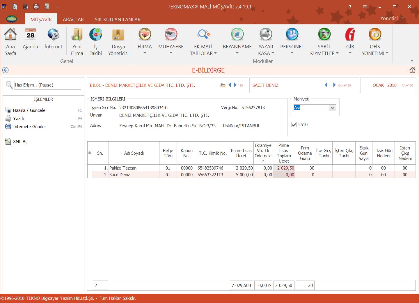 E-Bildirge, İşe Giriş Bildirimi, İşten Çıkış bildirimi gibi işlemlerinizi tek tuş ile program içerisinden gerçekleştirebilirsiniz.