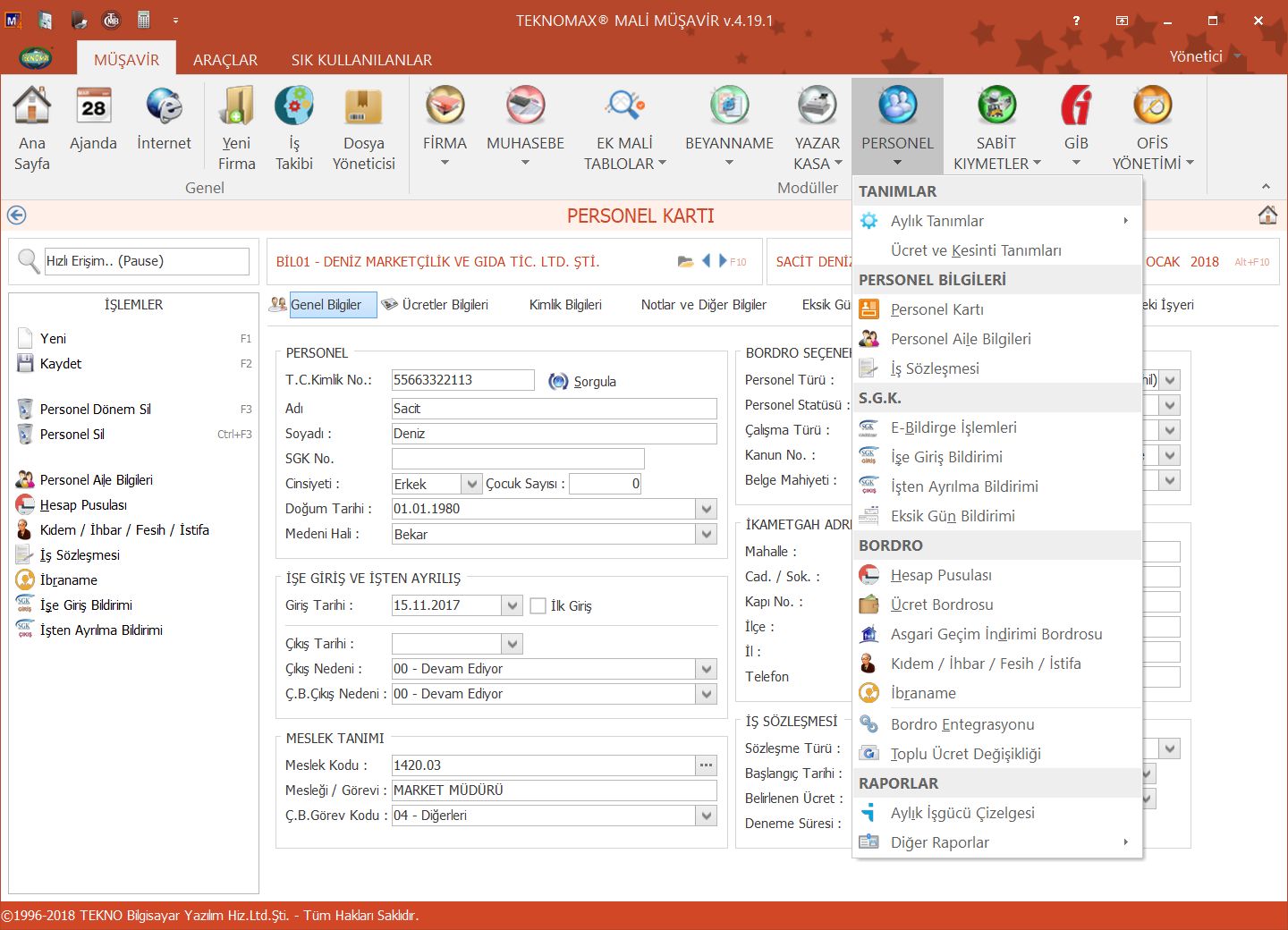 Personel modülü ile mükelleflerinize ait tüm personellerin özlük dosyalarını takip edebilir, ücret bordrosu, iş sözleşmesi, hesap pusulası, ibraname gibi çok sayıda raporu hazırlayabilirsiniz.