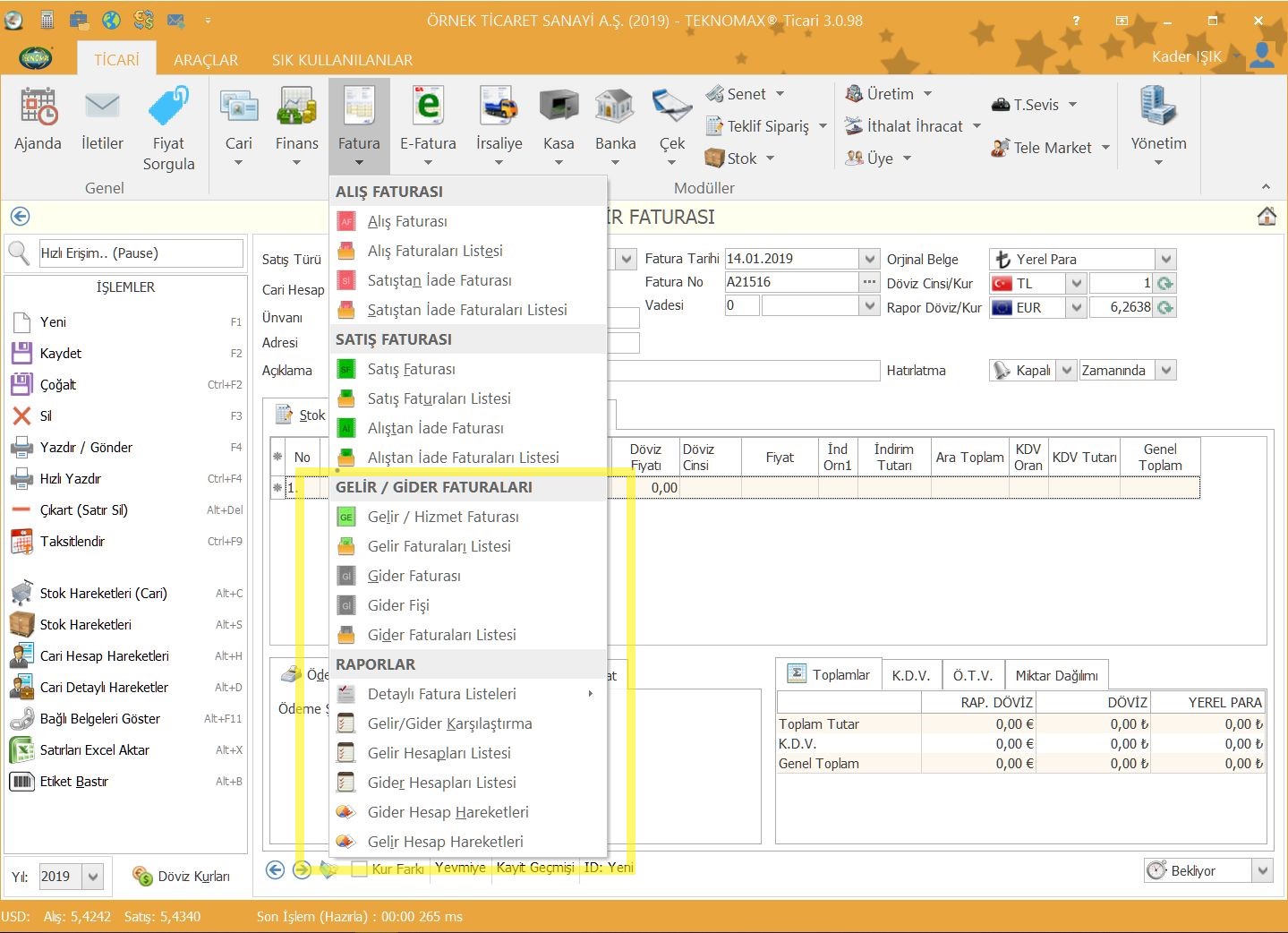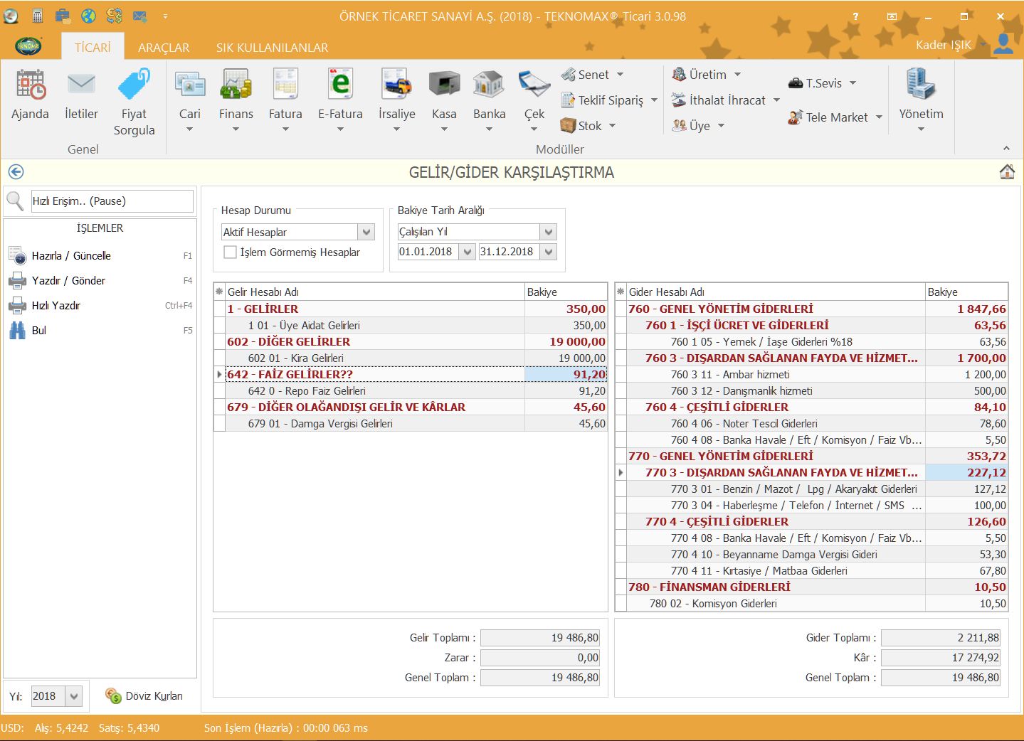 Firma açılışı sırasında sistemde bir çok veri hazır geldiği gibi aynı zamanda çok sık kullanılan gelir ve gider hesaplarıda otomatik tanımlanmış ve kullanıma hazır bir şekilde gelecektir. Siz hesap tanımları ile uğraşmak yerine direkt işlemlerin girişine başlayabilirsiniz.