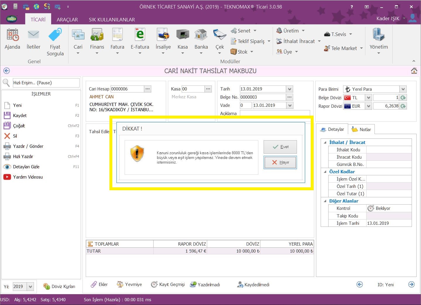 Nakit ödeme sınırını aşmanız durumunda Vergi Usul Kanuna göre cezalı duruma düşebilirsiniz, işlem yaparken program sizi bu hususta uyaracak ve hata yapmanızı önleyecektir.